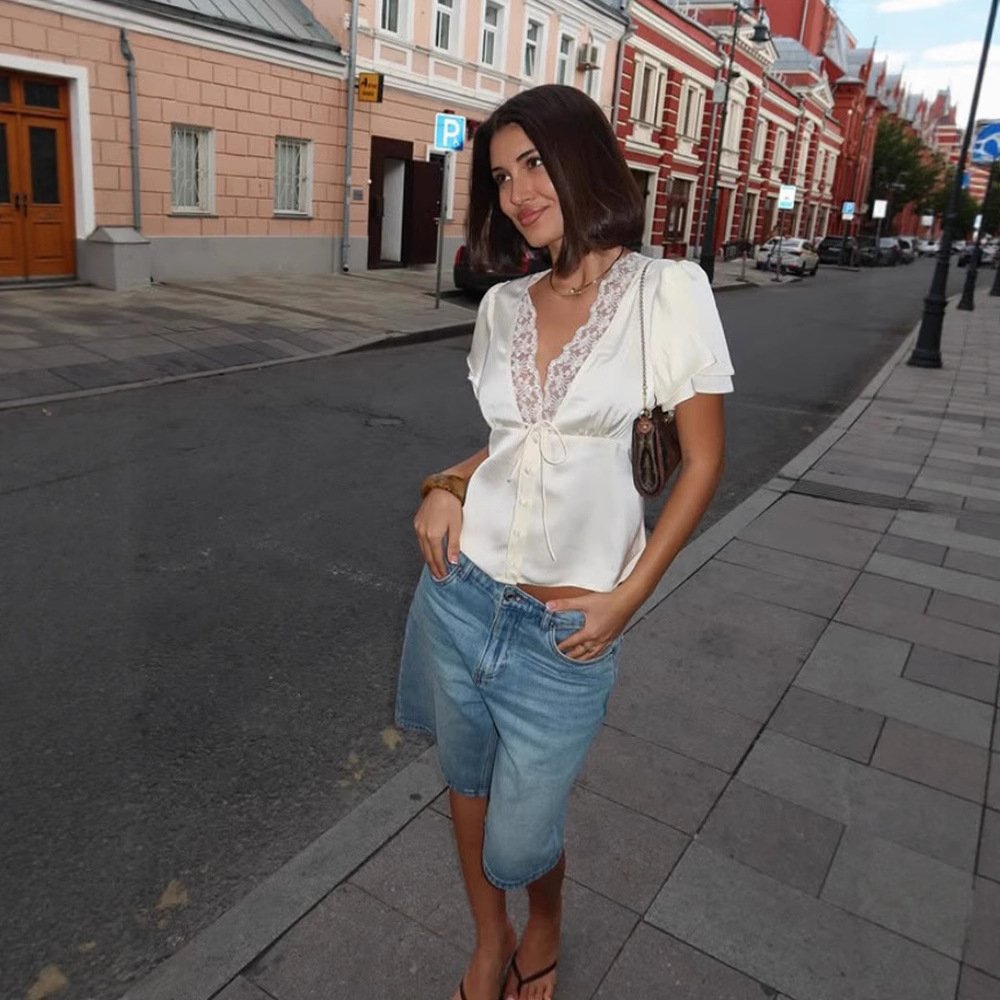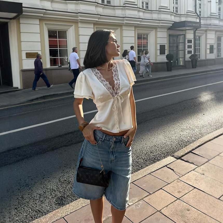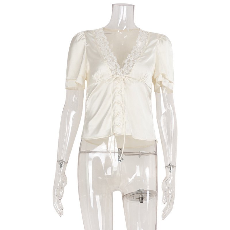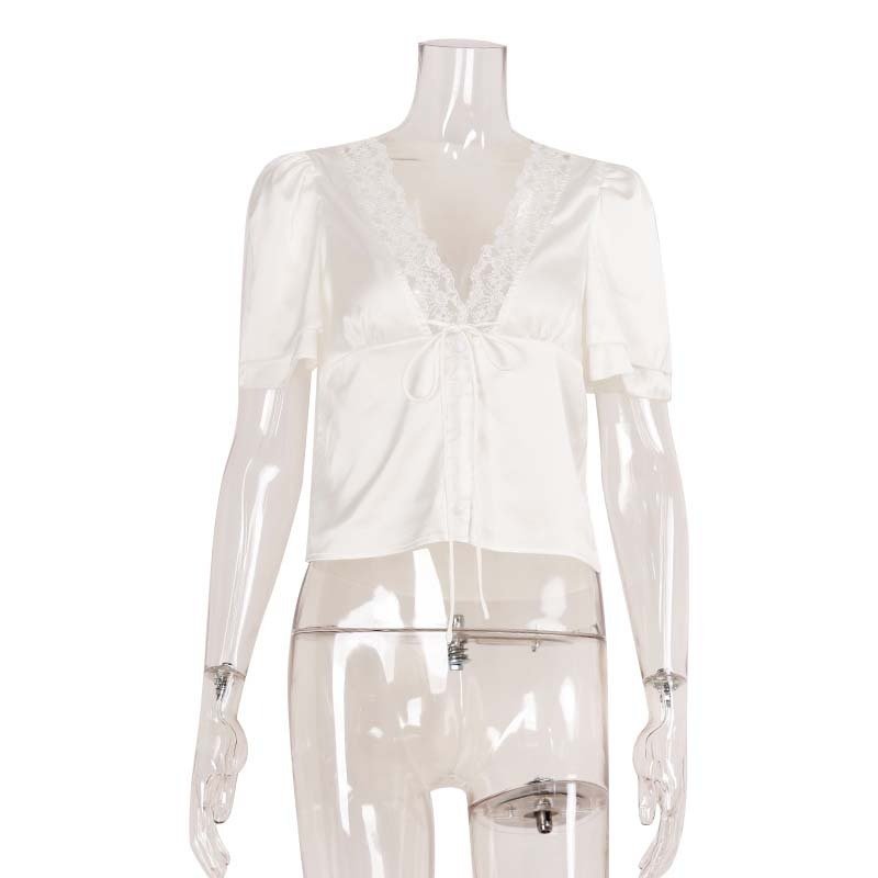 Fashion V-neck Lace Stitching Lace Up Slimming Short Sleeve